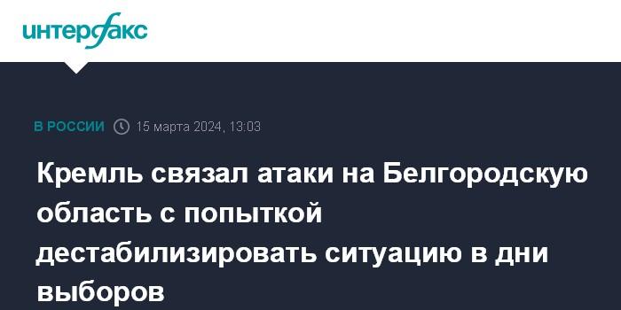 Москва. 15 марта. INTERFAX.RU - Атаки диверсионных групп в Белгородской области являются попытками дестабилизировать ситуацию в ходе выборов в РФ, заявил пресс-секретарь президента РФ Дмитрий Песков.