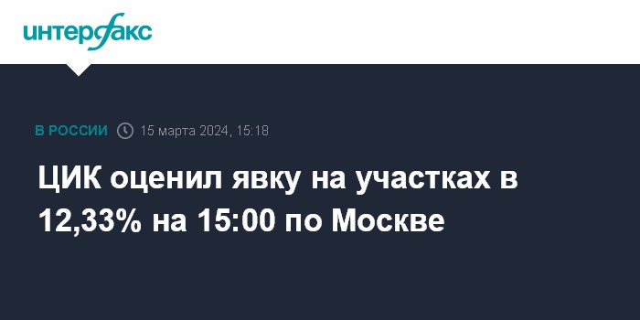 Москва. 15 марта. INTERFAX.RU - По данным на 15:00 по Москве на избирательных участках по всей России проголосовали 12,33% избирателей, сообщил Центризбирком.