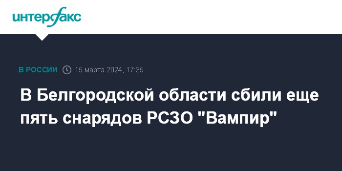 Москва. 15 марта. INTERFAX.RU - Российские военные уничтожили в воздухе над Белгородской областью пять реактивных снарядов системы залпового огня RM-70 "Вампир", сообщило министерство обороны РФ в пятницу.