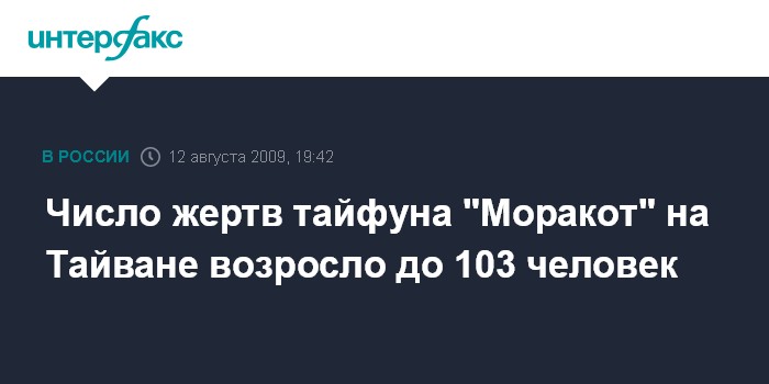 Мадрид. 12 августа. INTERFAX.RU - Количество жертв тихоокеанского тайфуна "Моракот", обрушившегося на остров Тайвань, увеличилось до 103 человек, сообщило в среду агентство ЭФЭ со ссылкой на спасательную службу Тайваня.