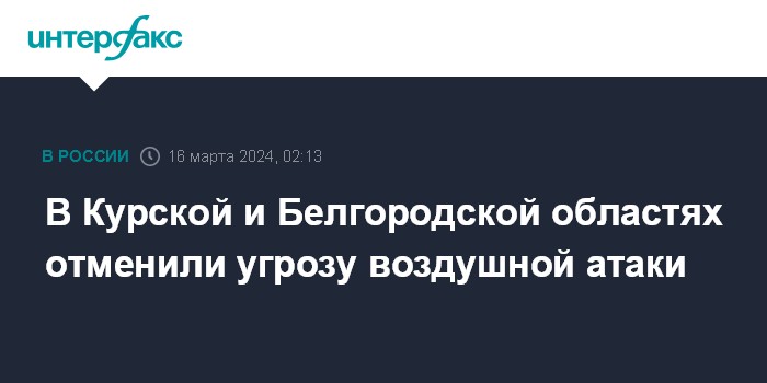Москва. 16 марта. INTERFAX.RU - Воздушную тревогу отменили в Курской и Белгородской областях.
