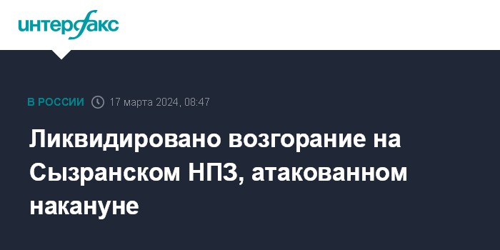 Москва. 17 марта. INTERFAX.RU - Пожарные ликвидировали возгорание на АО "Сызранский НПЗ" в Самарской области, где в результате атаки беспилотника в субботу утром загорелась установка по переработке нефтепродуктов.