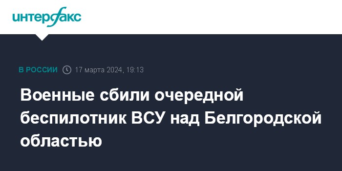 Москва. 17 марта. INTERFAX.RU - Российские военные сбили беспилотник самолетного типа над Белгородской областью, сообщили в Минобороны РФ.