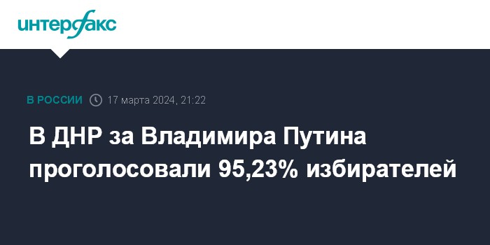 Москва. 17 марта. INTERFAX.RU - По итогам обработки 100% бюллетеней в Донецкой народной республике на выборах президента России за Владимира Путина проголосовали более 95%, сообщил председатель регионального избиркома Владимир Высоцкий.