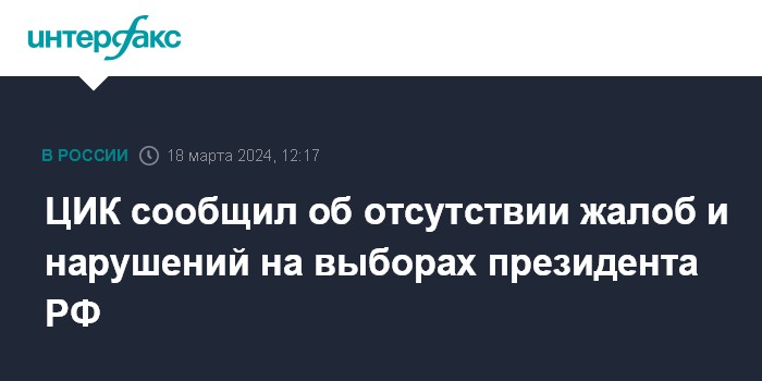 ЦИК сообщил об отсутствии жалоб и нарушений на выборах президента РФ