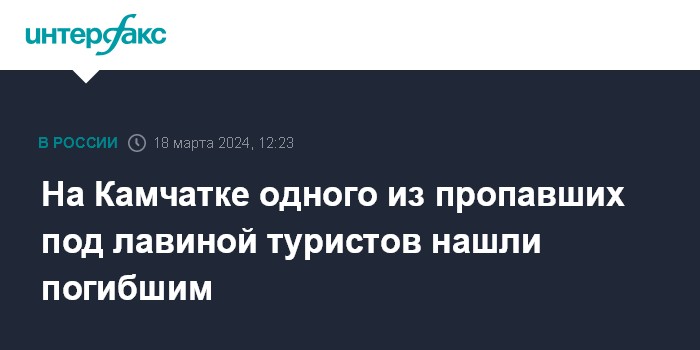 Москва. 18 марта. INTERFAX.RU - Обнаружено тело одного из двух туристов, попавших под лавину в районе перевала Красноармейский в Елизовском районе Камчатского края, сообщили "Интерфаксу" в правительстве Камчатского края.
