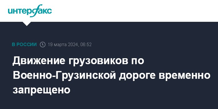 "В связи с ухудшением погодных условий на территории Грузии (...) запрещено движение большегрузных автотранспортных средств на участке г. Владикавказ - Ларс - в направлении на выезд из Российской Федерации с 03:10 мск 19 марта 2024 года до особого распоряжения", - говорится в сообщении.