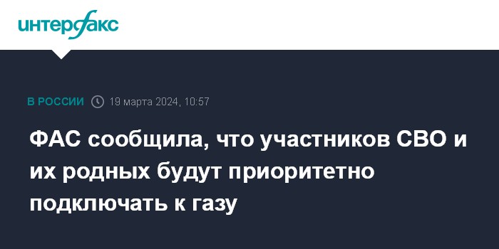 ФАС сообщила, что участников СВО и их родных будут приоритетно подключать к газу