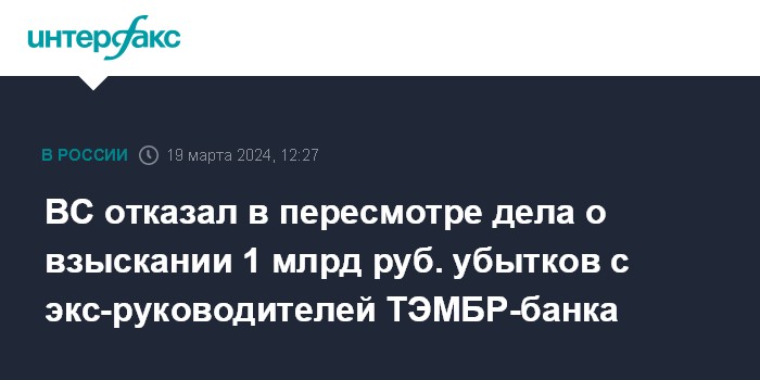 ВС отказал в пересмотре дела о взыскании 1 млрд руб. убытков с экс-руководителей ТЭМБР-банка