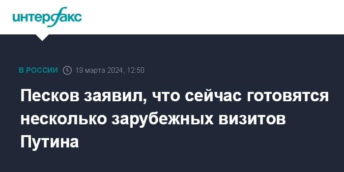 Москва. 19 марта. INTERFAX.RU - Несколько зарубежных визитов президента РФ Владимира Путина находятся в стадии подготовки, по мере приближения сроков о них будет объявлено, заявил пресс-секретарь главы государства Дмитрий Песков.