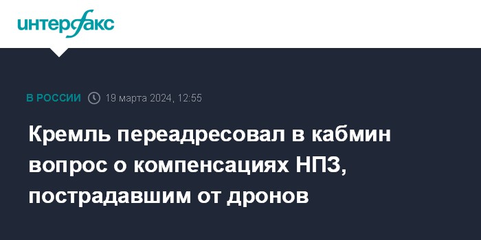 Москва. 19 марта. INTERFAX.RU - Пресс-секретарь президента РФ Дмитрий Песков переадресовал в правительство вопрос о том, будет ли выплачиваться компенсация российским НПЗ, пострадавшим от атак украинских беспилотников.