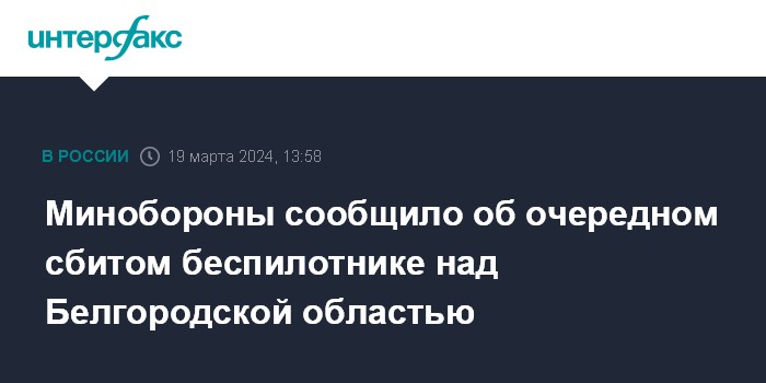 Москва. 19 марта. INTERFAX.RU - Дежурные средства ПВО сбили беспилотник самолетного типа над Белгородской областью, заявили в Минобороны.