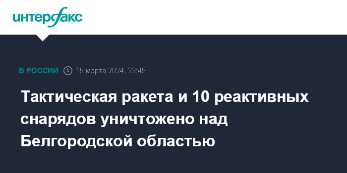 Москва. 19 марта. INTERFAX.RU - Российские военные заявили о перехвате около 22:00 мск во вторник над Белгородской областью украинской ракеты тактического комплекса "Точка-У" и 10 реактивных снарядов системы залпового огня RM-70 "Вампир".
