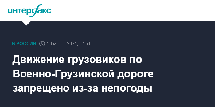 "В связи с ухудшением погодных условий на территории Грузии (...) запрещено движение большегрузных автотранспортных средств на участке г. Владикавказ - Ларс - в направлении на выезд из Российской Федерации с 01:00 мск 20 марта 2024 года до особого распоряжения", - говорится в сообщении.