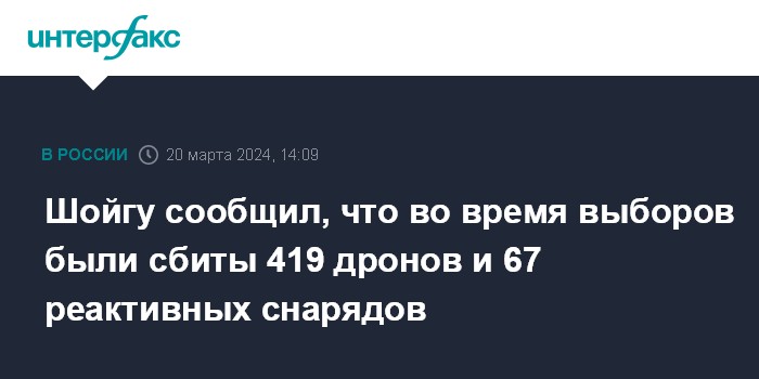 Москва. 20 марта. INTERFAX.RU - За время проведения выборов президента России уничтожено 419 украинских беспилотников и 67 реактивных снарядов, заявил министр обороны РФ Сергей Шойгу.