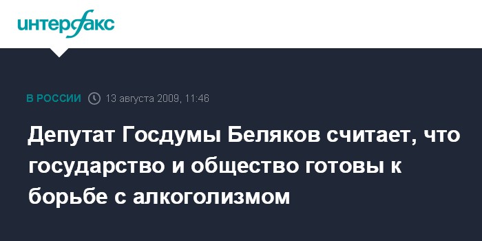 По мнению депутата, у внесенных им законопроектов есть хорошие шансы быть принятыми. "Во-первых, эти инициативы полностью соответствуют подходу, обозначенному руководителями страны, согласно которому борьба с пьянством является приоритетом политики государства в области здравоохранения, - сказал парламентарий. - Во-вторых, согласно последним исследованиям общественного мнения (в частности, ВЦИОМ), предложенные мной законодательные инициативы являются наиболее популярными среди россиян мерами борьбы с алкоголизмом". Беляков рассчитывает, что внесенные им поправки будут поддержаны нижней палатой парламента уже в начале открывающейся осенью сессии.