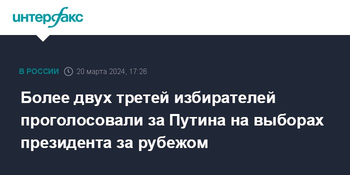 Ранее председатель зарубежной территориальной избирательной комиссии (ТИК) Евгения Орлова заявила, что более 383 тыс. граждан РФ проголосовали на выборах президента России за пределами страны.