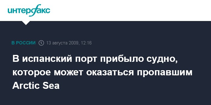 Москва. 13 августа. INTERFAX.RU - По данным главного редактора Интернет-издания "Морской бюллетень - Совфрахт" Михаила Войтенко, в испанский порт Сан-Себастьян прибыло судно, соответствующее по своим параметрам пропавшему сухогрузу Arctic Sea с российским экипажем на борту. По словам Войтенко, он получил SMS-сообщение, в котором говорилось, что "вчера в испанский порт Сан-Себастьян прибыло неизвестное судно, без имени, длиной 98 метров, а это длина сухогруза Arctic Sea".
