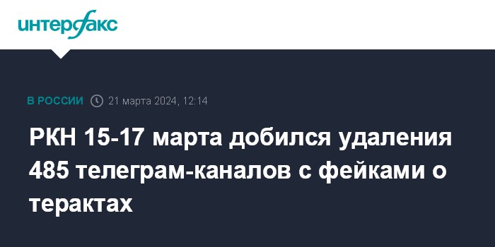РКН 15-17 марта добился удаления 485 телеграм-каналов с фейками о терактах