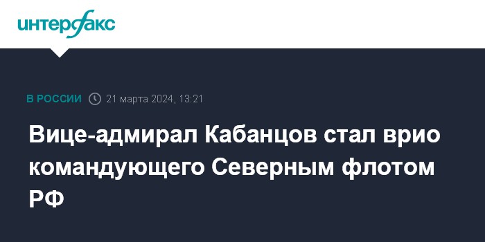 Москва. 21 марта. INTERFAX.RU - Временно исполняющим обязанности командующего Северным флотом стал вице-адмирал Константин Кабанцов, следует из сообщения пресс-службы флота, которое опубликовано на сайте Минобороны России.