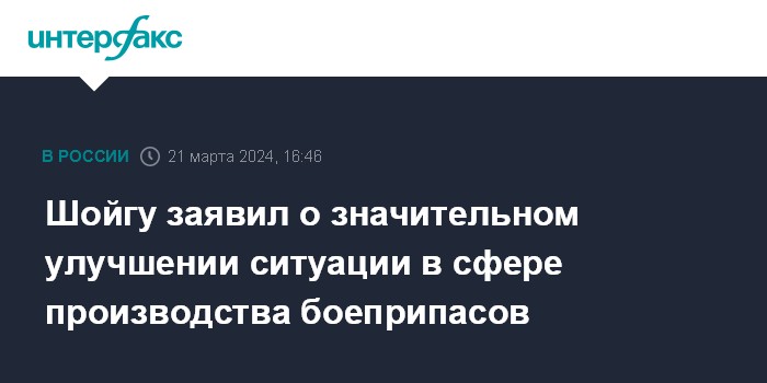 Москва. 21 марта. INTERFAX.RU - Министр обороны России Сергей Шойгу заявил, что в производстве артиллерийских боеприпасов и комплектующих к ним произошли серьёзные положительные изменения.