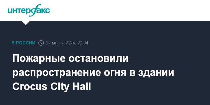 Москва. 22 марта. INTERFAX.RU - Пожарным удалось остановить распространение огня в здании Crocus City Hall, но крыша пока горит, передает с места событий корреспондент "Интерфакса".