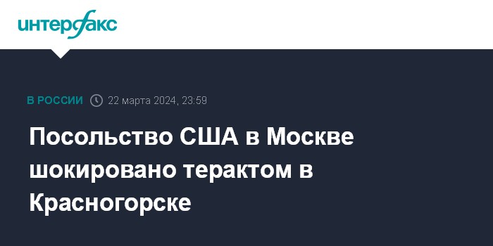 "Посольство США в Москве шокировано сообщениями о террористическом акте в Крокус Сити Холле в Москве", - говорится в сообщении посольства, опубликованном в его телеграм-канале.