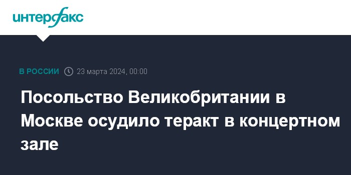 Москва. 22 марта. INTERFAX.RU - Посольство Великобритании в Москве осуждает теракт в красногорском концертном зале Crocus City Hall соболезнует близким пострадавших.