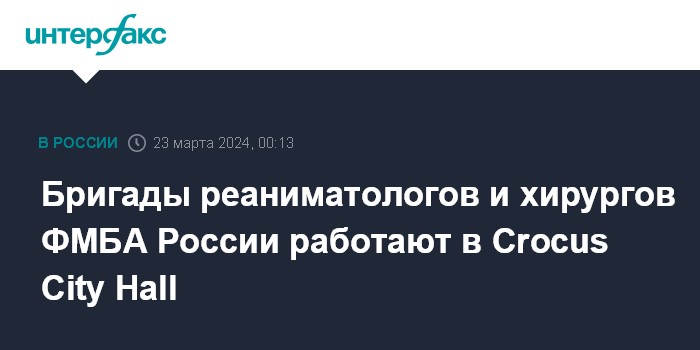 "Бригады реаниматологов, хирургов и психологов ФМБА России работают в составе оперштаба на месте теракта в Крокус Сити", - говорится в сообщении пресс-службы агентства.
