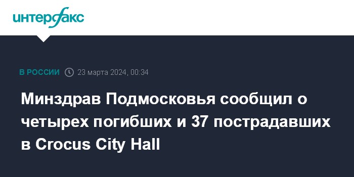 Москва. 23 марта. INTERFAX.RU - В результате теракта в Crocus City Hall в Красногорске пострадали 37 человек, четверо погибли, следует из списка пострадавших Московской областной станции скорой медицинской помощи, опубликованном на сайте Минздрава региона.