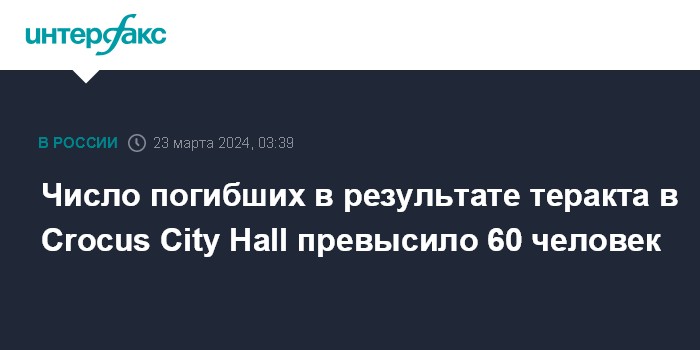 Москва. 23 марта. INTERFAX.RU - Следственный комитет России заявил, что в результате теракта в Crocus City Hall в Красногорске Московской области погибли более 60 человек.