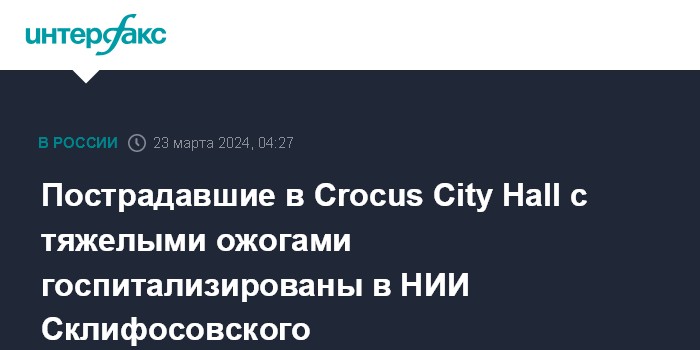 Пострадавшие в Crocus City Hall c тяжелыми ожогами госпитализированы в НИИ Склифосовского