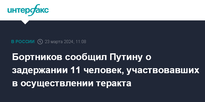 Москва. 23 марта. INTERFAX.RU - Директор ФСБ России Александр Бортников доложил президенту РФ Владимиру Путину о задержании 11 человек, в том числе всех четырех террористов, непосредственно участвовавших в осуществлении теракта в Crocus City Hall, сообщила в субботу пресс-служба Кремля.
