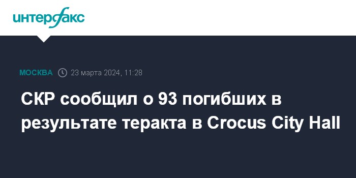 Москва. 23 марта. INTERFAX.RU - Количество погибших в результате теракта в подмосковном Crocus City Hall выросло до 93 человек, сообщили в Следственном комитете РФ (СКР).