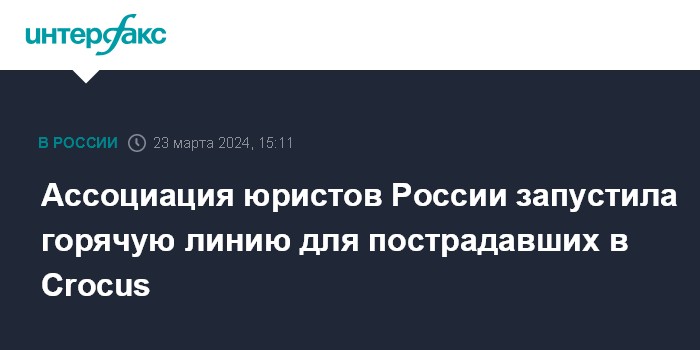 Москва. 23 марта. INTERFAX.RU - Ассоциация юристов России (АЮР) объявила о запуске горячей линии бесплатной правовой поддержки пострадавших и семей погибших в теракте в Crocus City Hall.