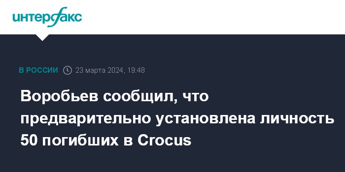 Москва. 23 марта. INTERFAX.RU - Губернатор Московской области Андрей Воробьев сообщил, что предварительно личности 50 погибших в результате теракта в Crocus City Hall установлены.