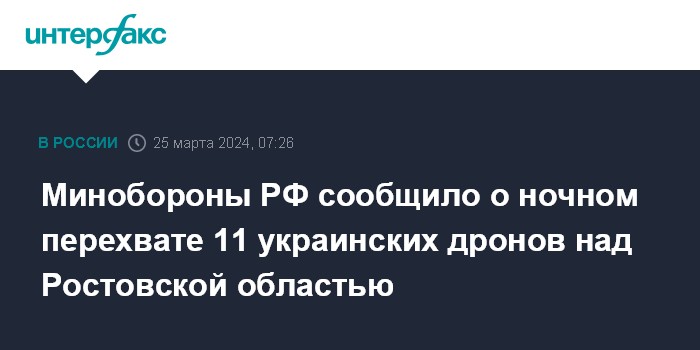 Москва. 25 марта. INTERFAX.RU - Российские военные заявили, что нейтрализовали в ночь на понедельник над Ростовской областью 11 украинских беспилотников самолетного типа.