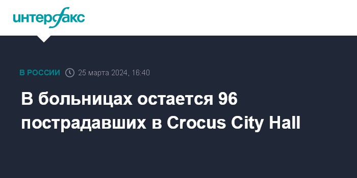 Москва. 25 марта. INTERFAX.RU - Минздрав Подмосковья сообщил, что, на 15:00 25 марта в больницах Москвы и области оставались 96 пострадавших в результате теракта в Crocus City Hall, за минувшие дни были выписаны 23 человека.
