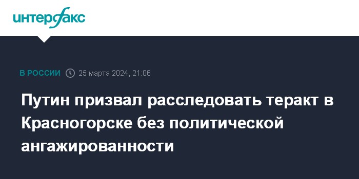 Москва. 25 марта. INTERFAX.RU - Расследование теракта в Crocus City Hall должно проводиться профессионально и без политической ангажированности, заявил президент РФ Владимир Путин.