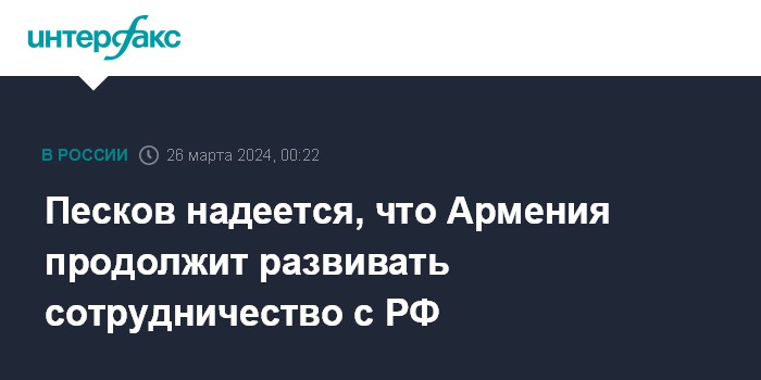 Песков надеется, что Армения продолжит развивать сотрудничество с РФ