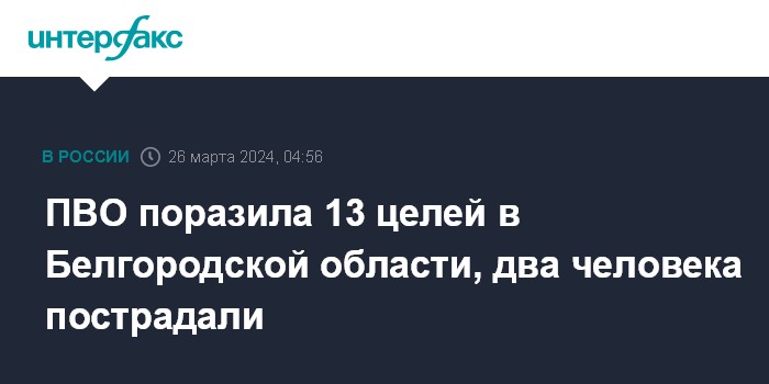 Москва. 26 марта. INTERFAX.RU - Средствами противовоздушной обороны поражено 13 целей над Белгородом и Белгородским районом, сообщил в своем телеграм-канале губернатор Вячеслав Гладков.