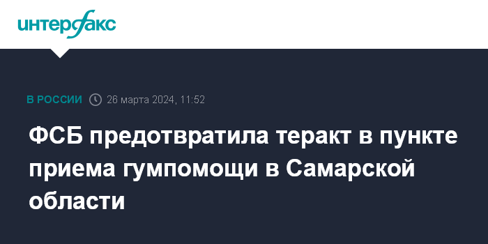 Москва. 26 марта. INTERFAX.RU - ФСБ заявила о предотвращении теракта в пункте приема гуманитарной помощи в Самарской области, его планировал пособник запрещенного в РФ террористического "Русского добровольческого корпуса".