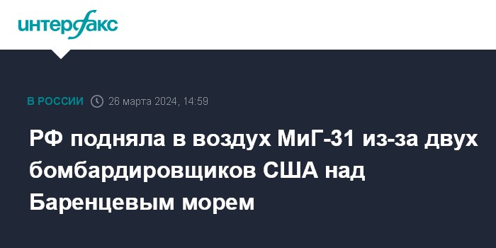 Москва. 26 марта. INTERFAX.RU - Истребитель-перехватчик дальнего радиуса действия МиГ-31 во вторник был поднят в воздух из-за приближения над Баренцевым морем к государственной границе РФ двух стратегических бомбардировщиков США, сообщило Минобороны РФ.