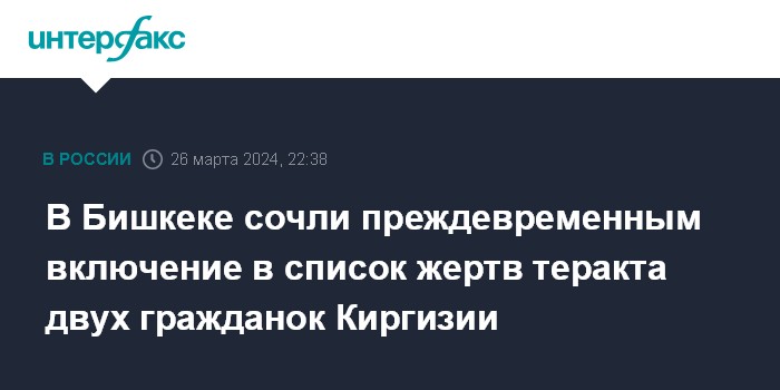 Москва. 26 марта. INTERFAX.RU - Информация о гибели двух гражданок Киргизии во время теракта в Crocus City Hall является преждевременной, заявили в МИД Киргизии.
