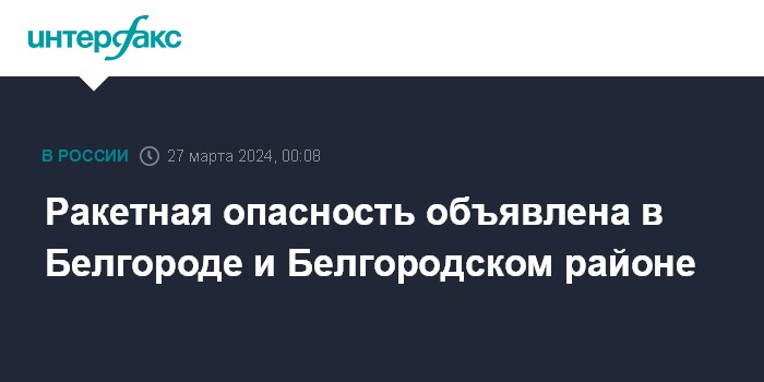 Москва. 27 марта. INTERFAX.RU - Сигнал ракетной опасности объявлен в Белгороде и Белгородском районе, сообщает ГУ МЧС региона.