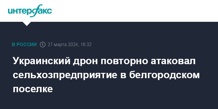 Москва. 27 марта. INTERFAX.RU - Белгородский губернатор Вячеслав Гладков сообщил о повторной атаке украинского беспилотника на сельхозпредприятие в поселке Поляна в среду.