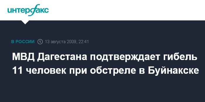 Махачкала. 13 августа. ИНТЕРФАКС-ЮГ - МВД Дагестана официально подтвердило, что число погибших в результате обстрела милицейского поста и находящейся рядом сауны в дагестанском Буйнакске составляет 11 человек.