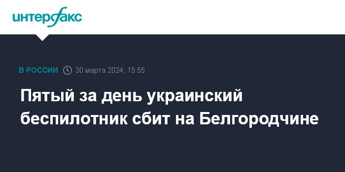 Москва. 30 марта. INTERFAX.RU - Российские военные заявили, что еще один украинский дрон ликвидирован в субботу около 15:15 по московскому времени над Белгородской областью.