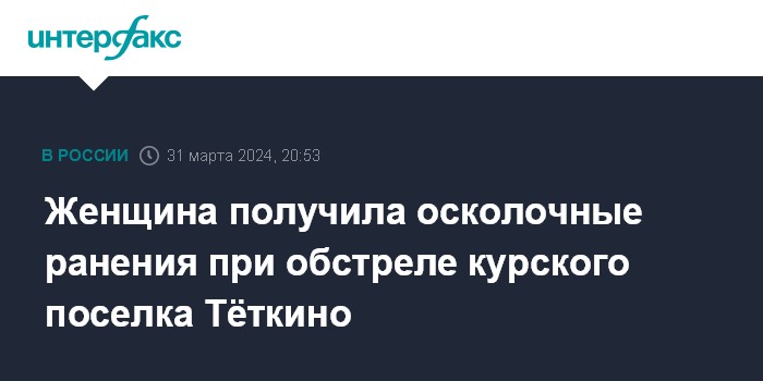 Москва. 31 марта. INTERFAX.RU - Поселок Тёткино в Глушковском районе Курской области был обстрелян со стороны Украины в воскресенье вечером, ранена женщина, сообщил губернатор Курской области Роман Старовойт.