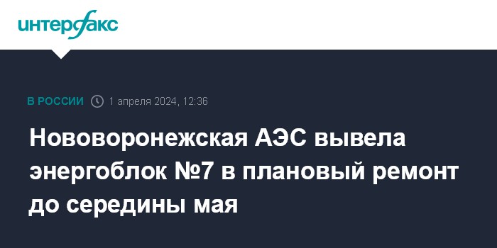 Москва. 1 апреля. INTERFAX.RU - Нововоронежская АЭС (филиал АО "Концерн Росэнергоатом") в подельник отключила седьмой энергоблок на плановый ремонт с элементами модернизации, сообщила пресс-служба атомной станции.